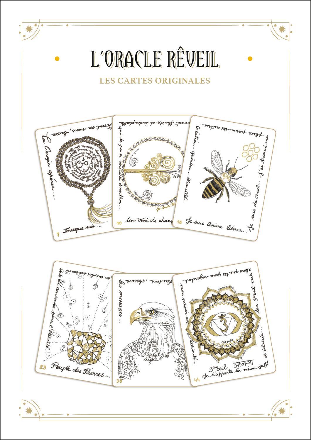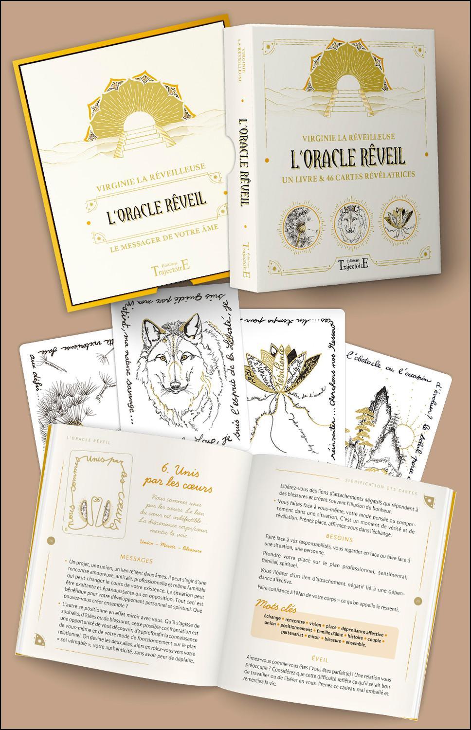 « Dessine ce que tu ressens. » Cette injonction, Virginie l'a reçue comme une libération pour sa créativité. Les cartes de « L'Oracle Rêveil » en sont issues. Ces images vibratoires et intuitives entrent en résonance avec nos corps subtils pour nous raconter une histoire, la nôtre ! Incitant à l'introspection, les mots et dessins en noir rehaussés d'or nous révèlent, nous réveillent et nous emmènent dans un rêve de lumière se démarquant de l'ombre. Les cartes peuvent être lues dans tous les sens… pour stimuler tous nos sens et révéler leurs sens profond. Ainsi, nous découvrons la richesse de différents points de vue ! Le livre d'accompagnement propose plusieurs tirages. Pour autant, nous sommes l'oracle, alors laissons libre cours à notre imagination éveillons-nous à une nouvelle existence.