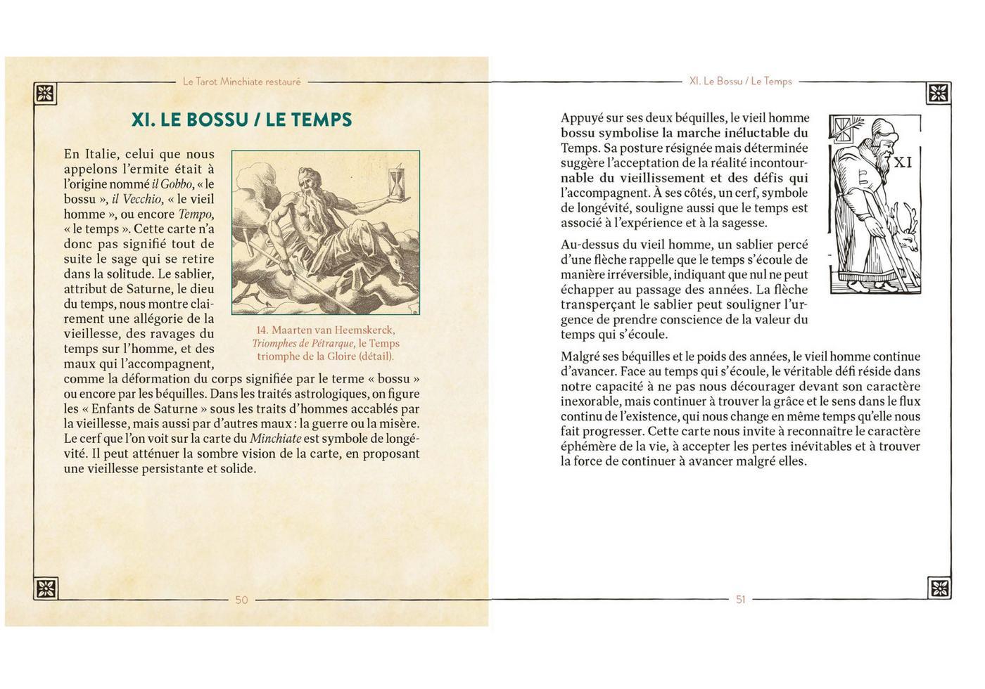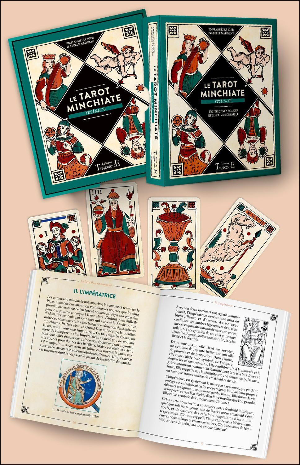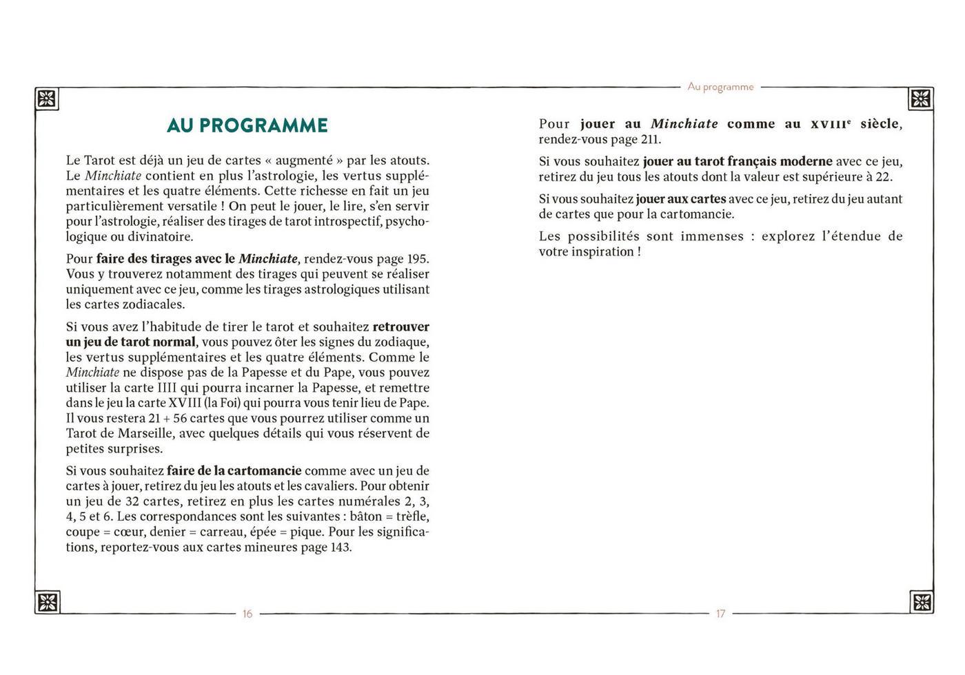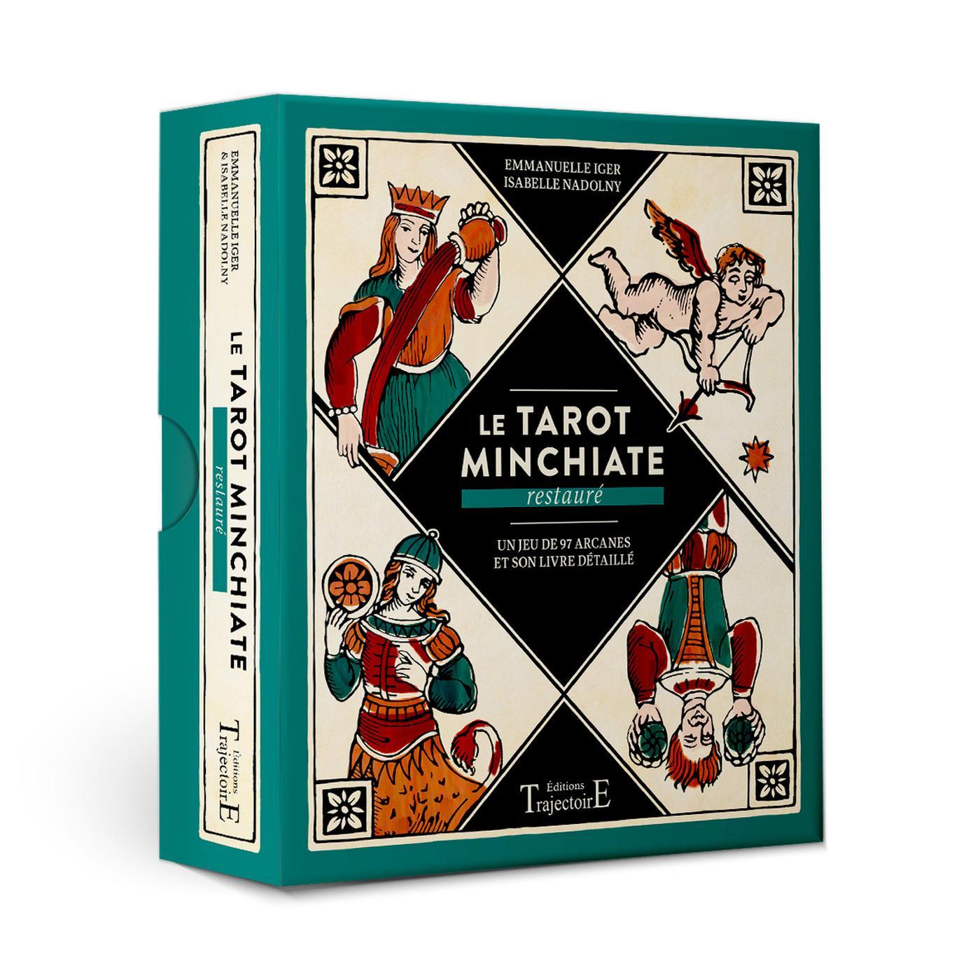 Plongez dans l’histoire oubliée du Tarot italien avec le Minchiate, un jeu mystérieux de 97 cartes qui possède une remarquable particularité : 41 arcanes majeurs. Véritable chaînon manquant de l’histoire du Tarot, le Minchiate offre une toute nouvelle dimension à la lecture des cartes, en enrichissant précieusement le vocabulaire des tirages et en replaçant chaque arcane dans un contexte historique précis. Il ajoute aux arcanes habituels les douze signes du zodiaque, les quatre éléments et complète la liste des vertus (Prudence, Foi, Espérance et Charité). Fidèle au minutieux trait du maître italien, Gaetano, qui donna vie au Minchiate de Bologne en 1763, ce jeu singulier aux couleurs originales ici méticuleusement restaurées ravira les initiés comme les néophytes. Son livre d’accompagnement contient l’histoire détaillée de chaque arcane pour resituer leur lecture dans le contexte culturel de l’époque, un dictionnaire complet de significations, de nombreuses propositions de tirages ainsi que la règle du jeu originale.