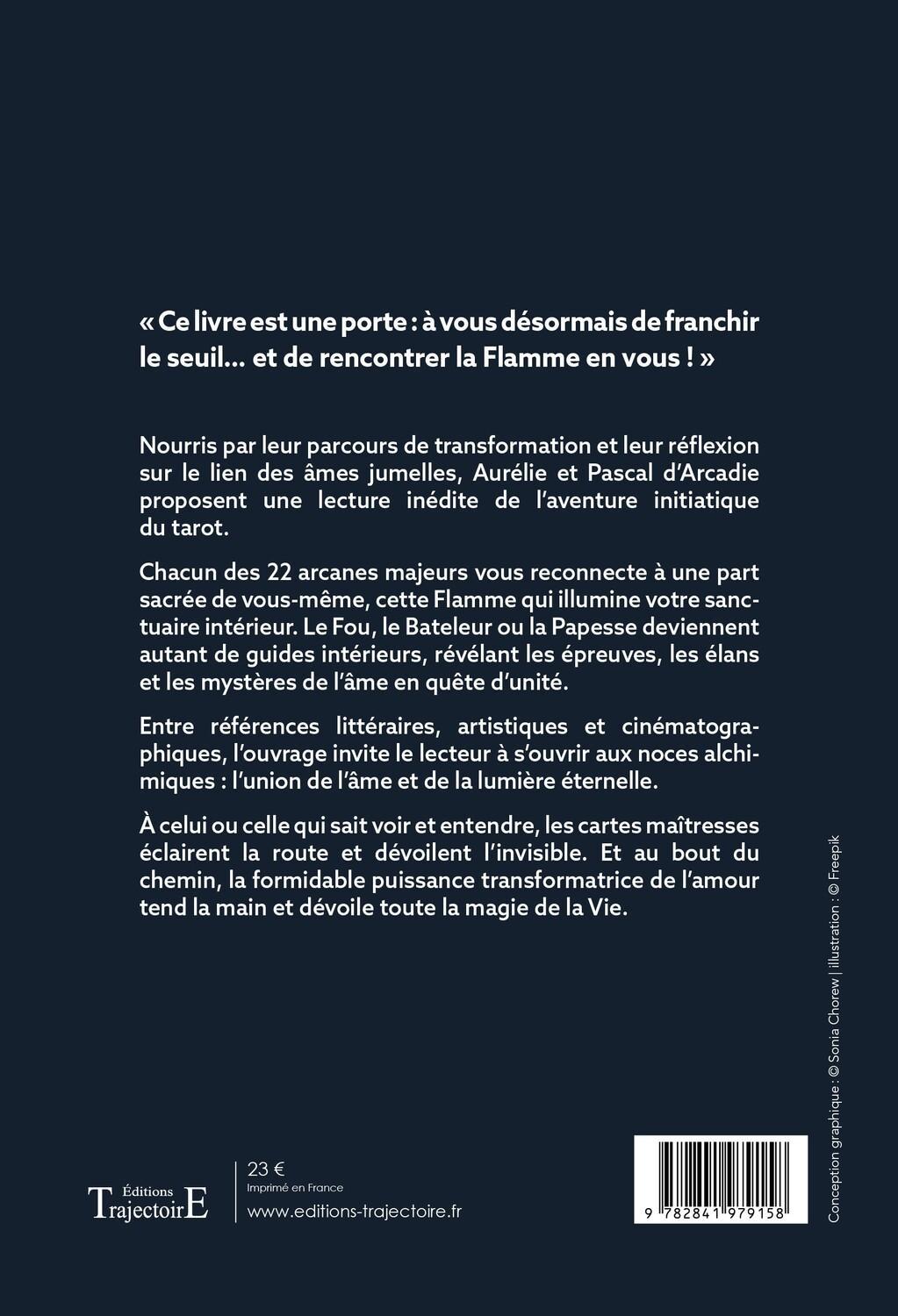 Nourris par leur parcours de transformation et leur réflexion sur le lien des âmes jumelles, Aurélie et Pascal d’Arcadie proposent une lecture inédite de l’aventure initiatique du tarot. Chacun des 22 Arcanes Majeurs vous reconnecte à une part sacrée de vous-même, cette flamme qui illumine votre sanctuaire intérieur. Le Fou, le Bateleur ou la Papesse deviennent autant de guides intérieurs, révélant les épreuves, les élans et les mystères de l’âme en quête d’unité. Entre références littéraires, artistiques et cinématographiques, l’ouvrage invite le lecteur à s’ouvrir aux noces alchimiques : l’union de l’âme et de la lumière éternelle. À celui ou celle qui sait voir et entendre, les cartes maîtresses éclairent la route et dévoilent l’invisible. Et au bout du chemin, la formidable puissance transformatrice de l’amour tend la main et dévoile toute la magie de la Vie.