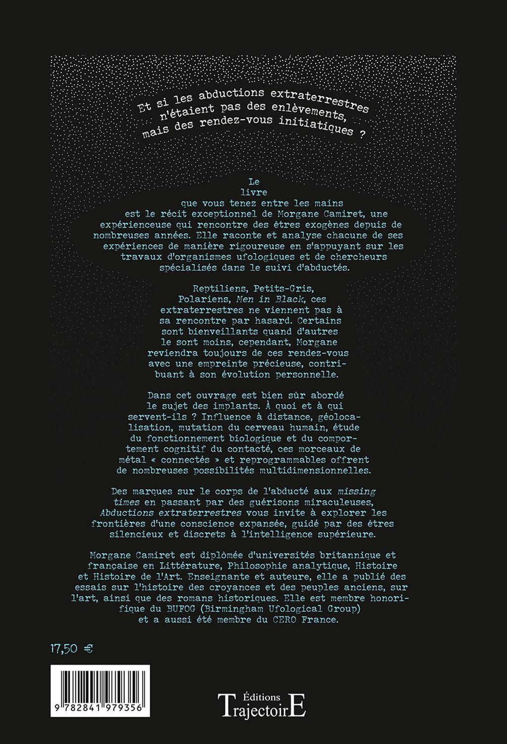 Et si les abductions extraterrestres n’étaient pas des enlèvements, mais des rendez-vous initiatiques ? Le livre que vous tenez entre les mains est le récit exceptionnel de Morgane Sylvia Camiret, une expérienceuse qui rencontre des êtres exogènes depuis de nombreuses années. Elle raconte et analyse chacune de ses expériences de manière rigoureuse en s’appuyant sur les travaux d’organismes ufologiques et de chercheurs spécialisés dans le suivi d’abductés. Reptiliens, Petits-Gris, Polariens, Men in Black, ces extraterrestres ne viennent pas à sa rencontre par hasard. Certains sont bienveillants quand d’autres le sont moins, cependant, Morgane reviendra toujours de ces rendez-vous avec une empreinte précieuse, contribuant à son évolution personnelle. Dans cet ouvrage est bien sûr abordé le sujet des implants. À quoi et à qui servent-ils ? Influence à distance, géolocalisation, mutation du cerveau humain, étude du fonctionnement biologique et du comportement cognitif du contacté, ces morceaux de métal « connectés » et reprogrammables offrent de nombreuses possibilités multidimentionnelles. Des marques sur le corps de l'abducté aux missing times en passant par des guérisons miraculeuses, Abductions extraterrestres vous invite à explorer les frontières d’une conscience expansée, guidé par des êtres silencieux et discrets à l’intelligence supérieure.